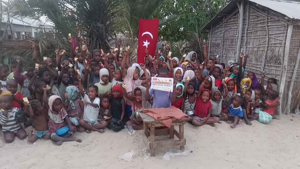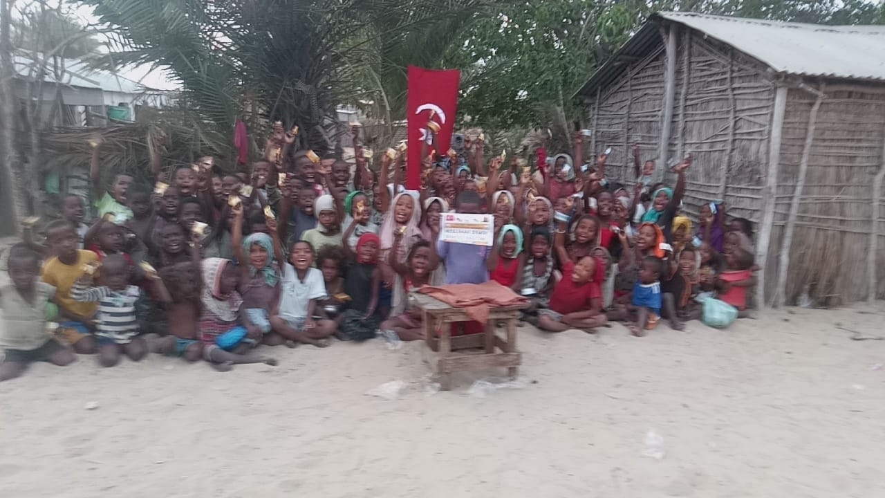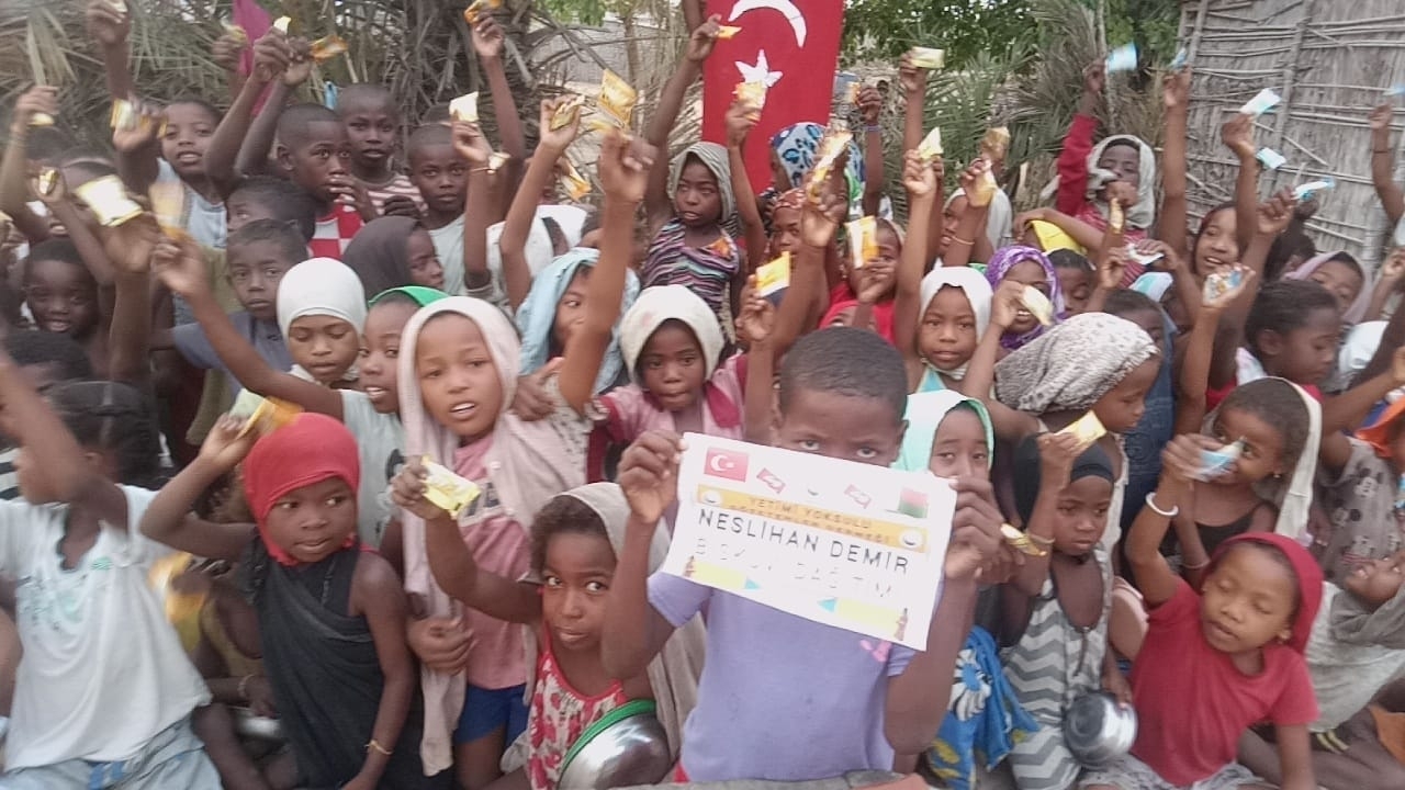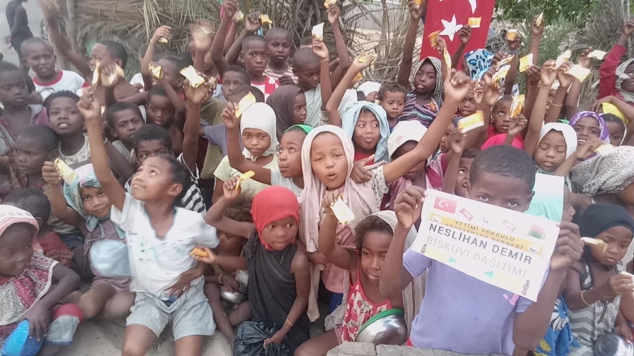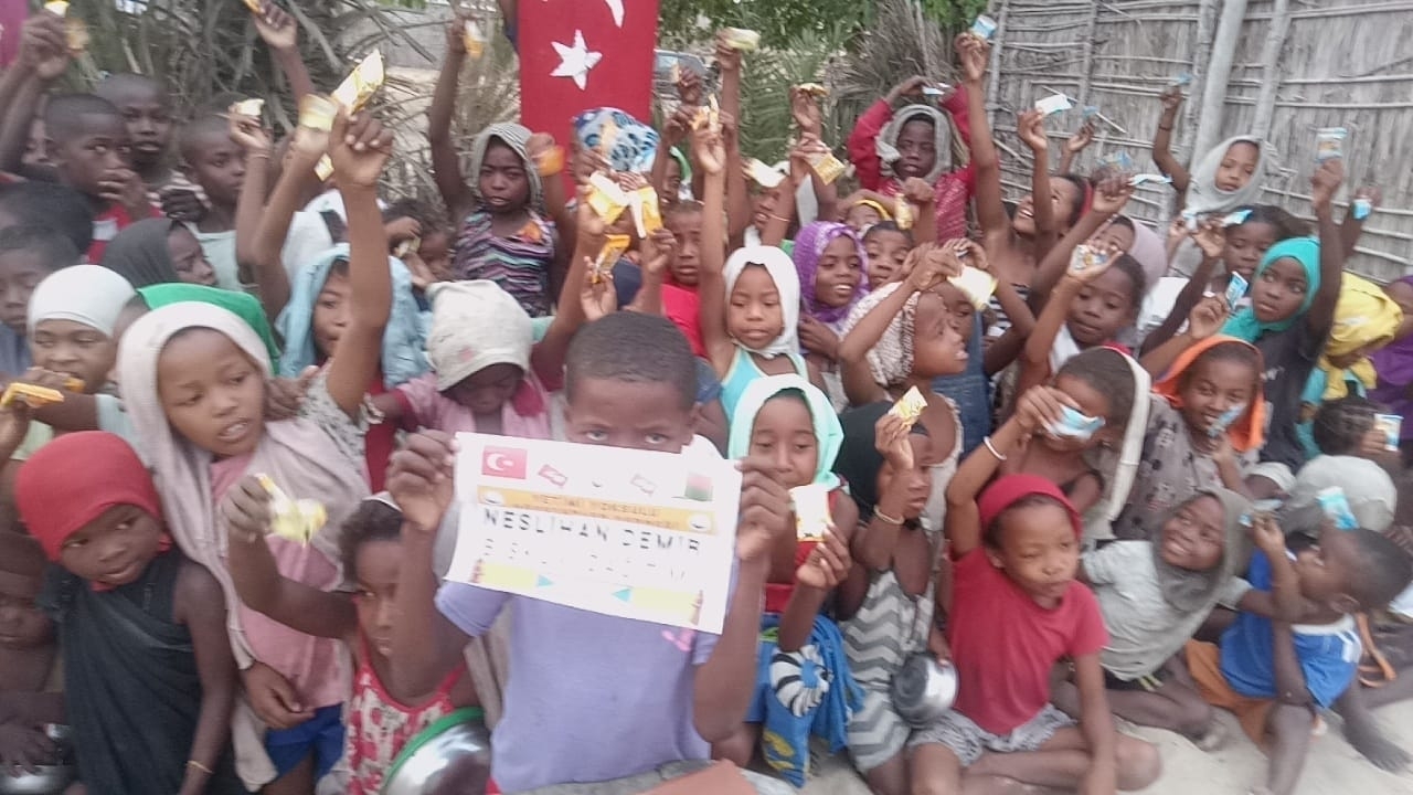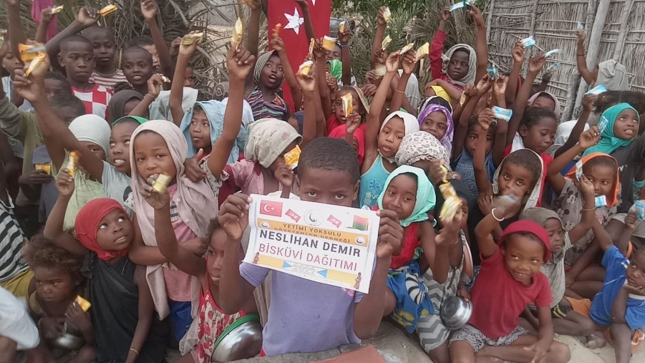 Afrika Madagaskar'da yetim ve yoksul çocuklara bisküvi dağıtarak sevinçlerine ortak olduk